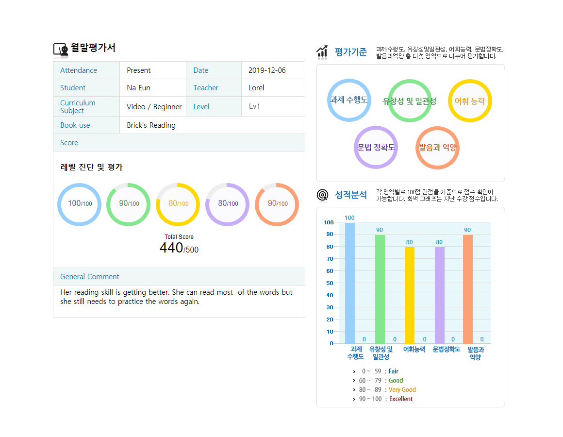 레벨평가의 결과를 근거로 교재나 수업 수준을 변경할 수 있습니다.